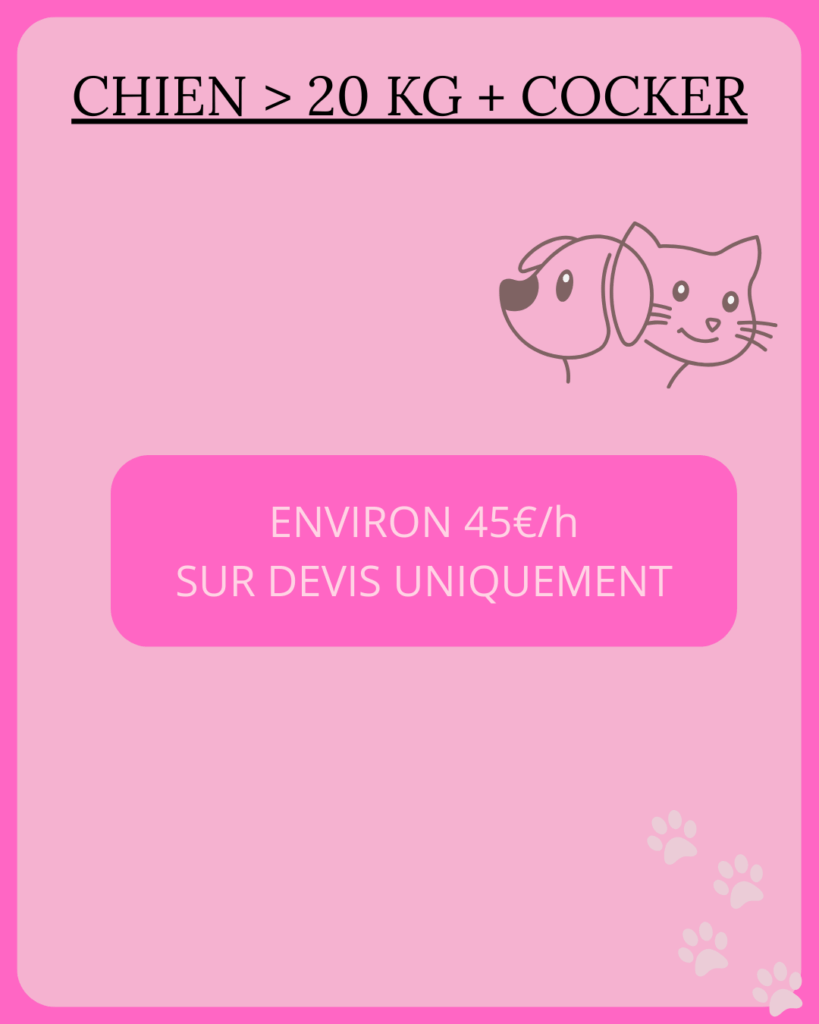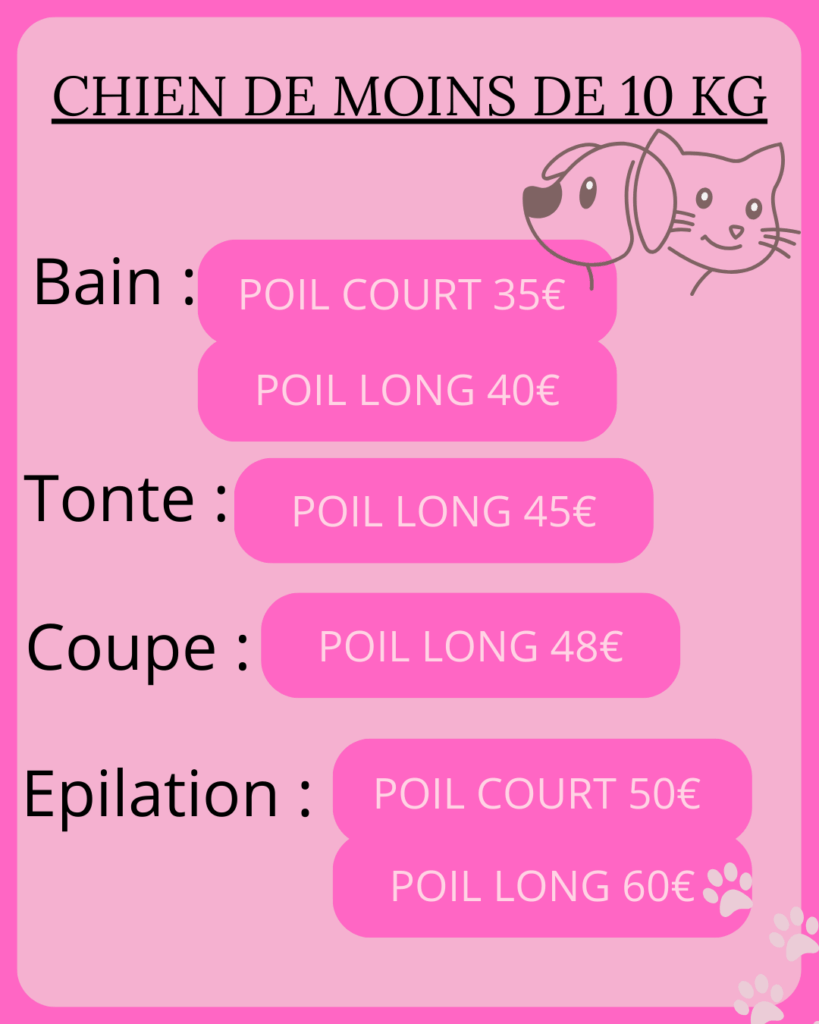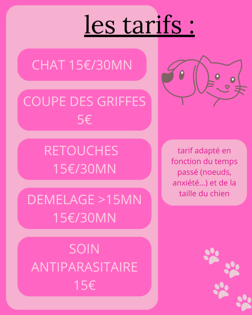 démêlage raisonnable (15mn), tonte hygiénique (dessous de ventre et sous la queue), soins yeux et oreilles si besoin, coupe des griffes si besoin, entretien des coussinets, bain avec shampoing bio et fabriqué en France, crème de soin si besoin, séchage, brushing