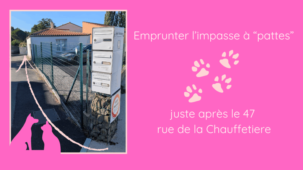 Par soucis du voisinage merci de ne pas emprunter l’impasse en voiture (sauf raison de santé auquel cas merci de me le préciser pour que je vous ouvre le portail afin de vous garer dans ma cours).